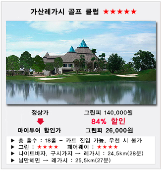 가산 레가시 골프장은 총 7,089야드 파72/18홀로 이루어져 있으며 호수를 낀 아름다운 홀들은 적당한 난이도 가 있어 정교한 샷을 요구하는 골프장이기도 합니다. 또한 바로 옆 5분거리에는 가산 파노라마 골프장이 위치 하고 있어 오전.오후 라운딩을 이동하며 이용할 수 있으며 공항(시내)에서 25km 차로 약 27분 거리의 가까운 곳에 위치하여 관광도 함께 즐길 수 있는 치앙마이 최고의 골프장입니다.